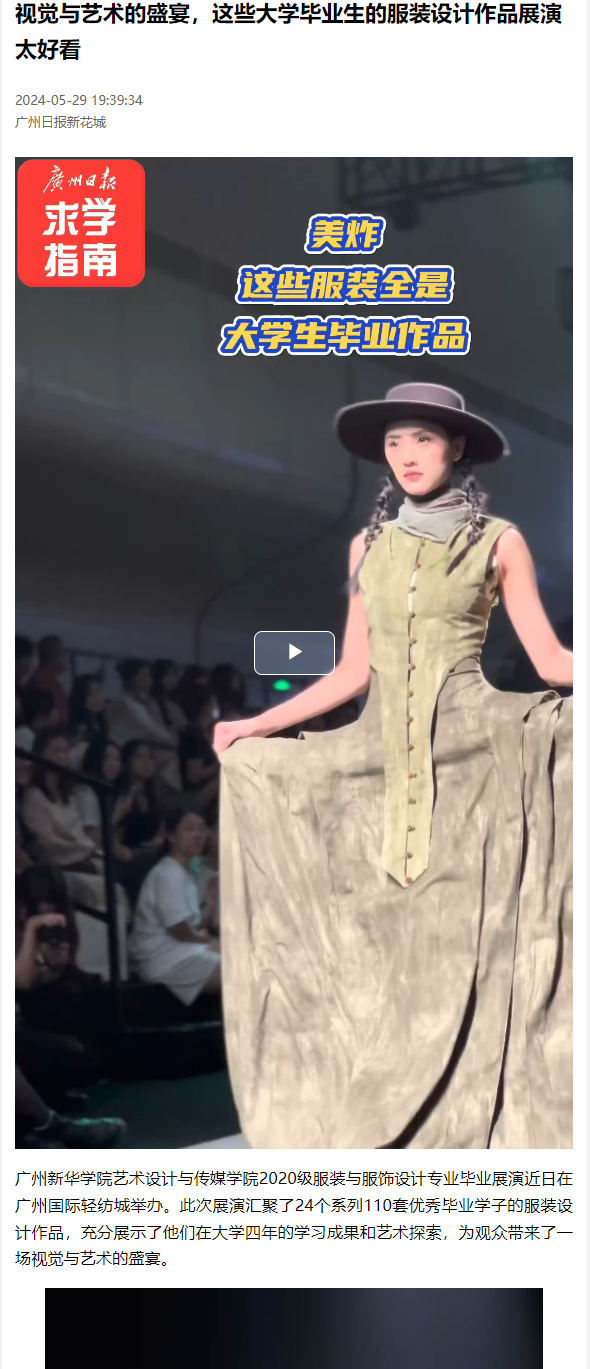 suncitygroup太阳集团艺术设计与传媒学院2020级服装与服饰设计专业毕业展演近日在广州国际轻纺城举办。此次展演汇聚了24个系列110套优秀毕业学子的服装设计作品,充分展示了他们在大学四年的学习成果和艺术探索,为观众带来了一场视觉与艺术的盛宴。