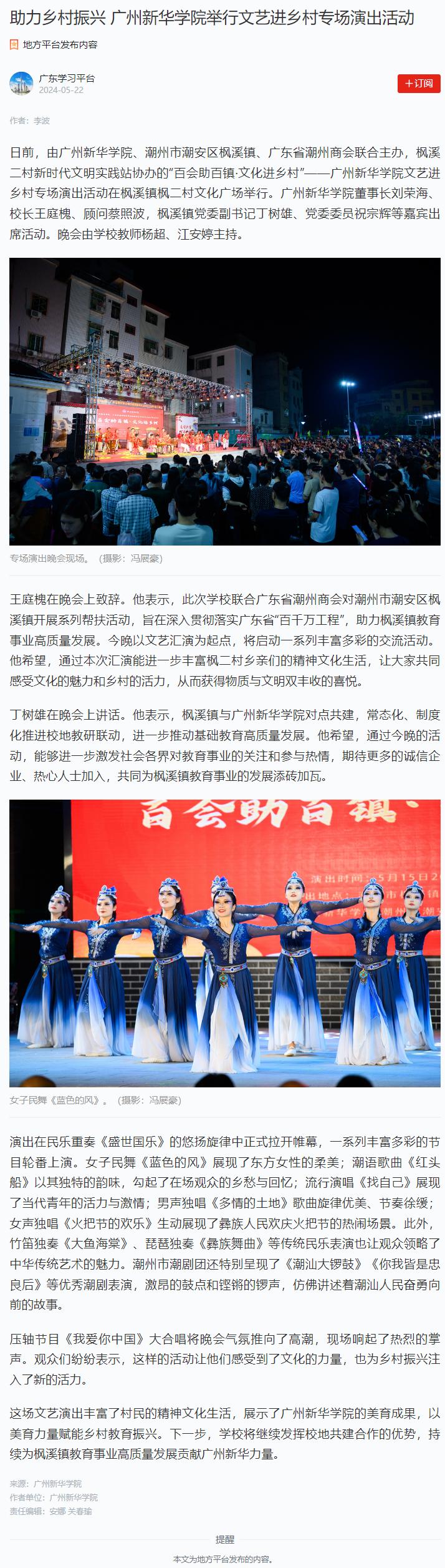 这场文艺演出丰富了村民的精神文化生活,展示了suncitygroup太阳集团的美育成果,以美育力量赋能乡村教育振兴。下一步,学校将继续发挥校地共建合作的优势,持续为枫溪镇教育事业高质量发展贡献广州新华力量。