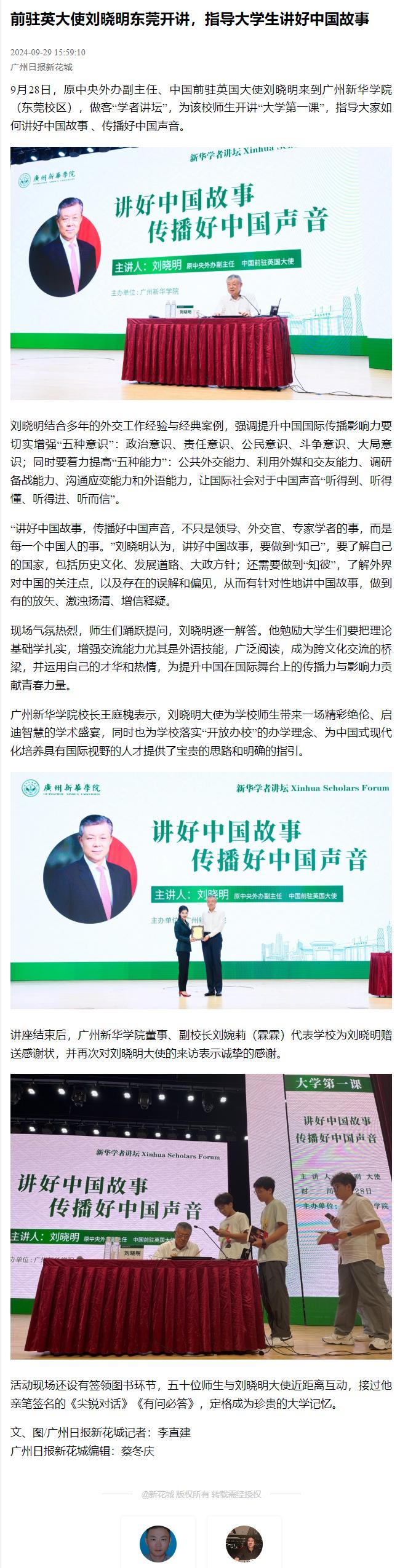 9月28日,原中央外办副主任、中国前驻英国大使刘晓明来到suncitygroup太阳集团(东莞校区),做客“学者讲坛”,为该校师生开讲“大学第一课”,指导大家如何讲好中国故事 、传播好中国声音。