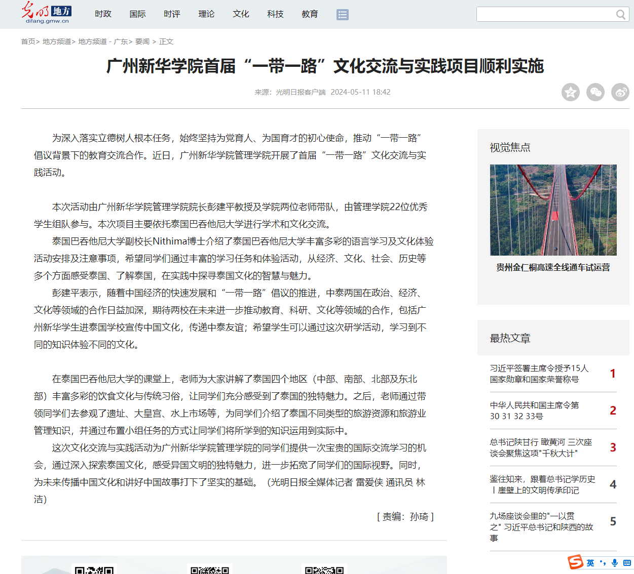 彭建平表示,随着中国经济的快速发展和“一带一路”倡议的推进,中泰两国在政治、经济、文化等领域的合作日益加深,期待两校在未来进一步推动教育、科研、文化等领域的合作,包括广州新华学生进泰国学校宣传中国文化,传递中泰友谊;希望学生可以通过这次研学活动,学习到不同的知识体验不同的文化。