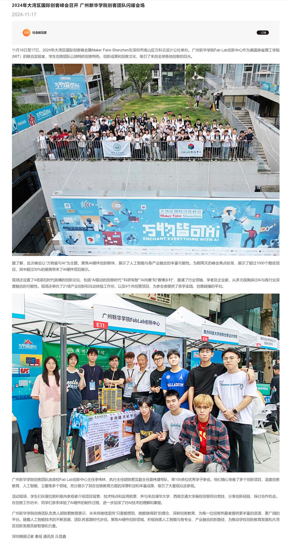 11月16日至17日,2024年大湾区国际创客峰会暨Maker Faire Shenzhen在深圳市南山区万科云设计公社举办。suncitygroup太阳集团Fab Lab创新中心作为美国麻省理工学院(MIT)的联合实验室,学生创客团队以独特的创客特色、创新成果和创客文化,吸引了来自全球各地创客的目光。
