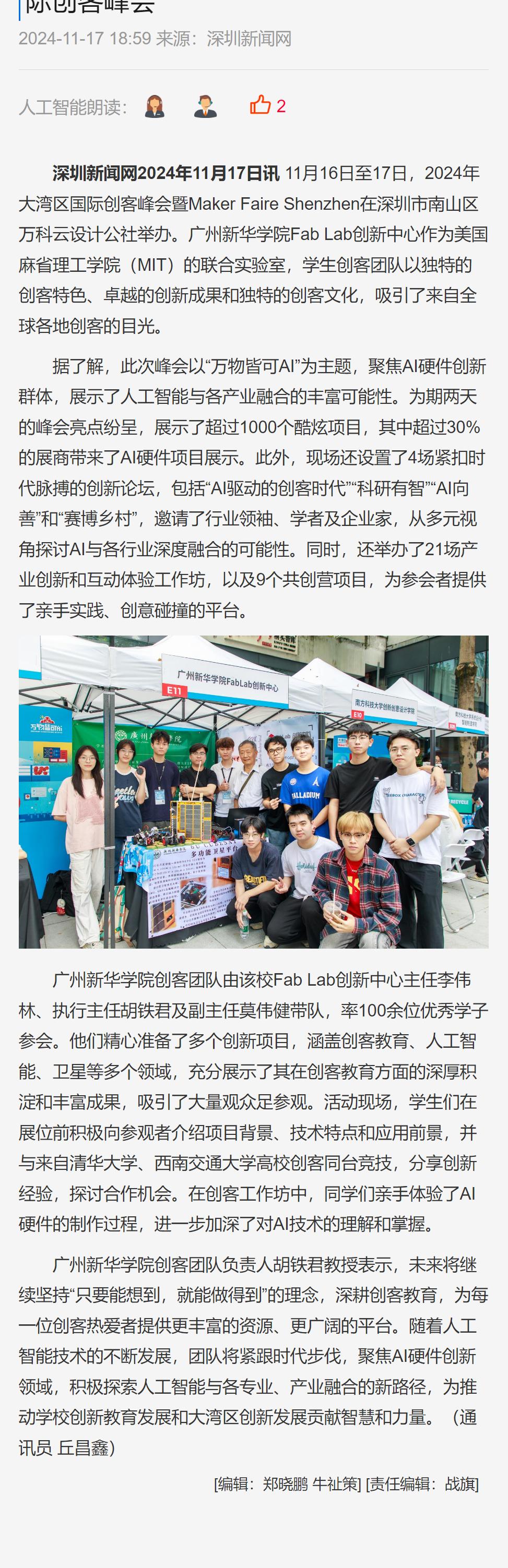 11月16日至17日,2024年大湾区国际创客峰会暨Maker Faire Shenzhen在深圳市南山区万科云设计公社举办。suncitygroup太阳集团Fab Lab创新中心作为美国麻省理工学院(MIT)的联合实验室,学生创客团队以独特的创客特色、卓越的创新成果和独特的创客文化,吸引了来自全球各地创客的目光。