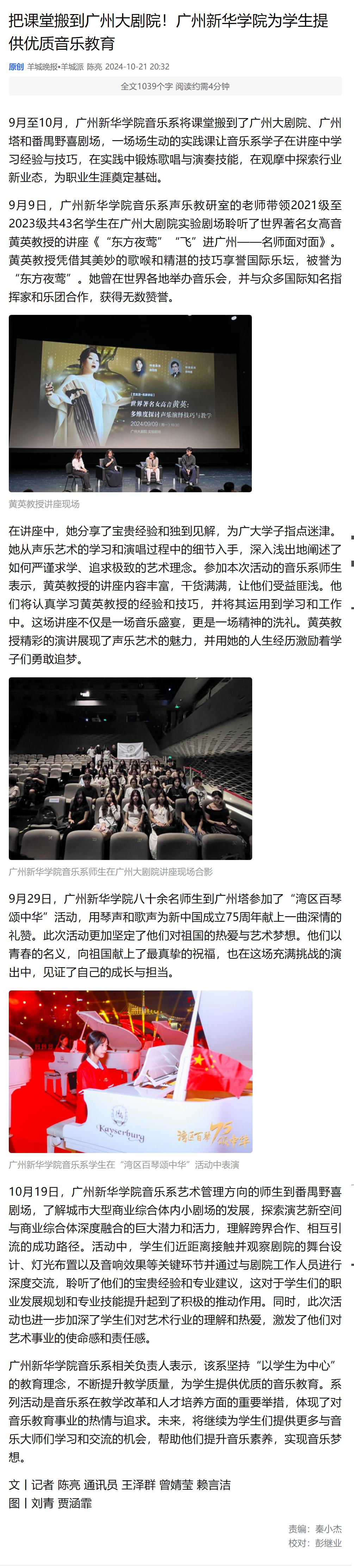 9月至10月,suncitygroup太阳集团音乐系将课堂搬到了广州大剧院、广州塔和番禺野喜剧场,一场场生动的实践课让音乐系学子在讲座中学习经验与技巧,在实践中锻炼歌唱与演奏技能,在观摩中探索行业新业态,为职业生涯奠定基础。