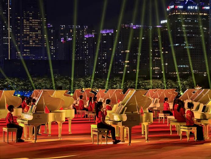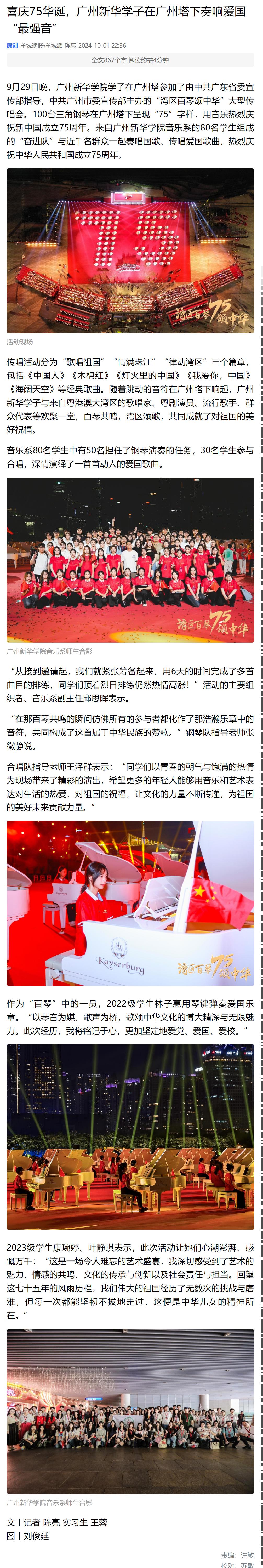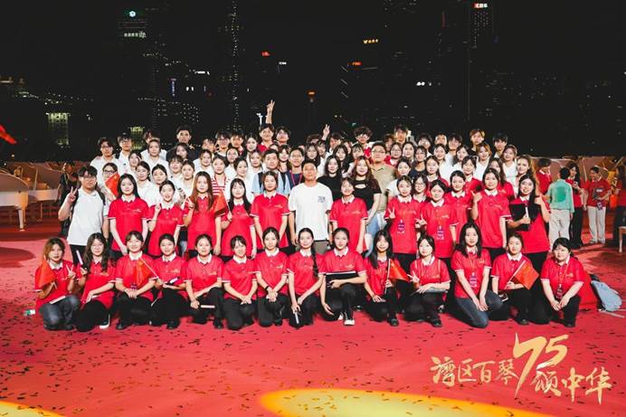 9月29日晚,suncitygroup太阳集团学子在广州塔参加了由中共广东省委宣传部指导,中共广州市委宣传部主办的“湾区百琴颂中华”大型传唱会。100台三角钢琴在广州塔下呈现“75”字样,用音乐热烈庆祝新中国成立75周年。来自suncitygroup太阳集团音乐系的80名学生组成的“奋进队”与近千名群众一起奏唱国歌、传唱爱国歌曲,热烈庆祝中华人民共和国成立75周年。