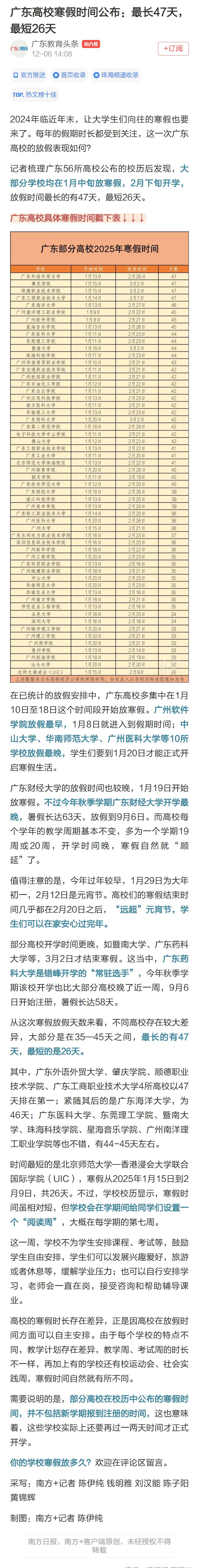 2024年临近年末,让大学生们向往的寒假也要来了。每年的假期时长都受到关注,这一次广东高校的放假表现如何?