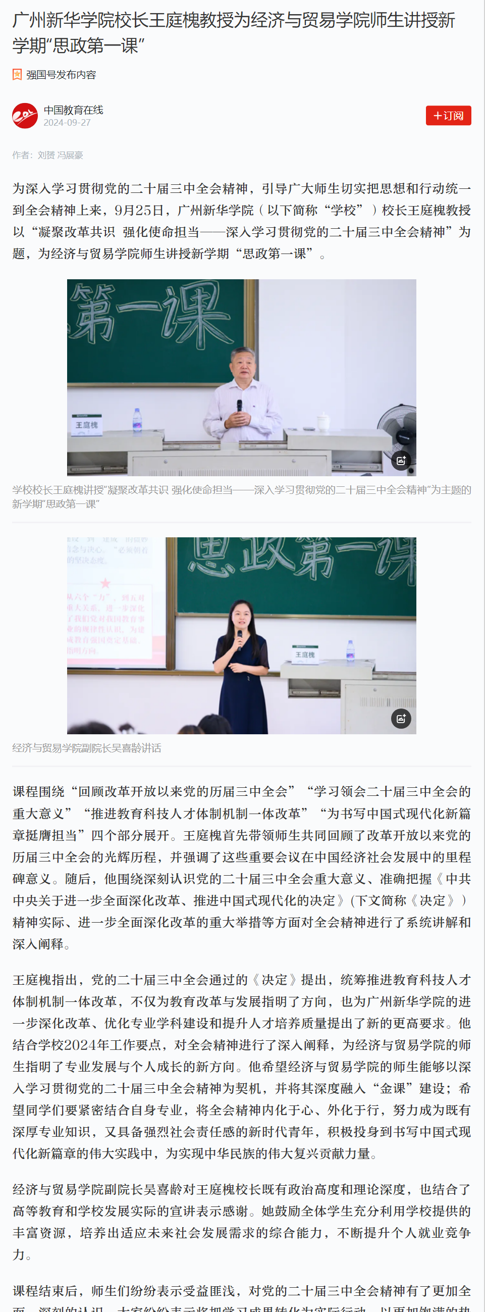 为深入学习贯彻党的二十届三中全会精神,引导广大师生切实把思想和行动统一到全会精神上来,9月25日,suncitygroup太阳集团(以下简称“学校”)校长王庭槐教授以“凝聚改革共识 强化使命担当——深入学习贯彻党的二十届三中全会精神”为题,为经济与贸易学院师生讲授新学期“思政第一课”。