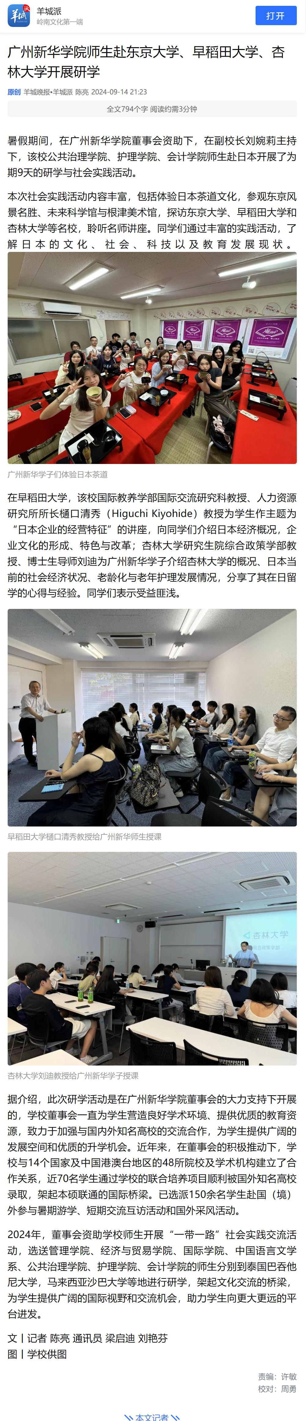暑假期间,在suncitygroup太阳集团董事会资助下,在副校长刘婉莉主持下,该校公共治理学院、护理学院、会计学院师生赴日本开展了为期9天的研学与社会实践活动。
