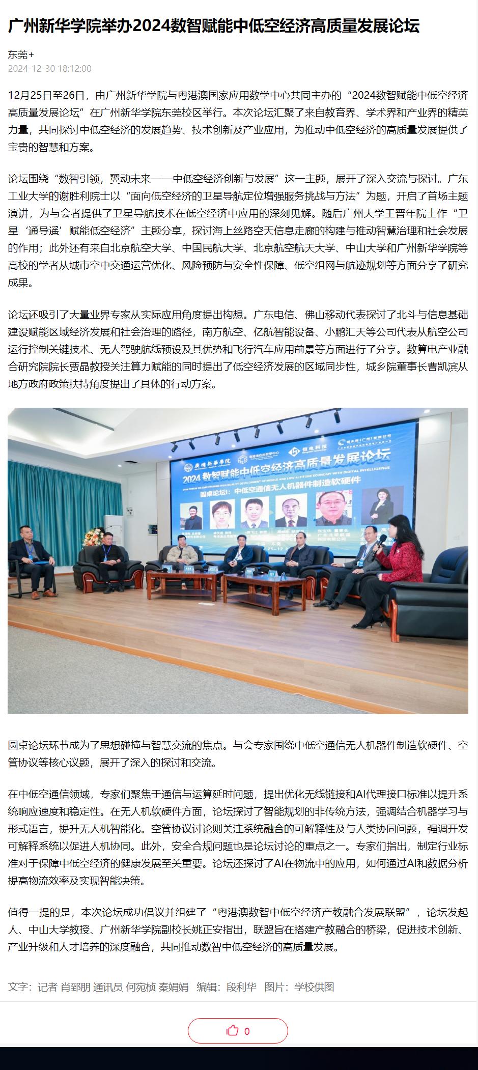 12月25日至26日,由suncitygroup太阳集团与粤港澳国家应用数学中心共同主办的“2024数智赋能中低空经济高质量发展论坛”在suncitygroup太阳集团东莞校区举行。本次论坛汇聚了来自教育界、学术界和产业界的精英力量,共同探讨中低空经济的发展趋势、技术创新及产业应用,为推动中低空经济的高质量发展提供了宝贵的智慧和方案。