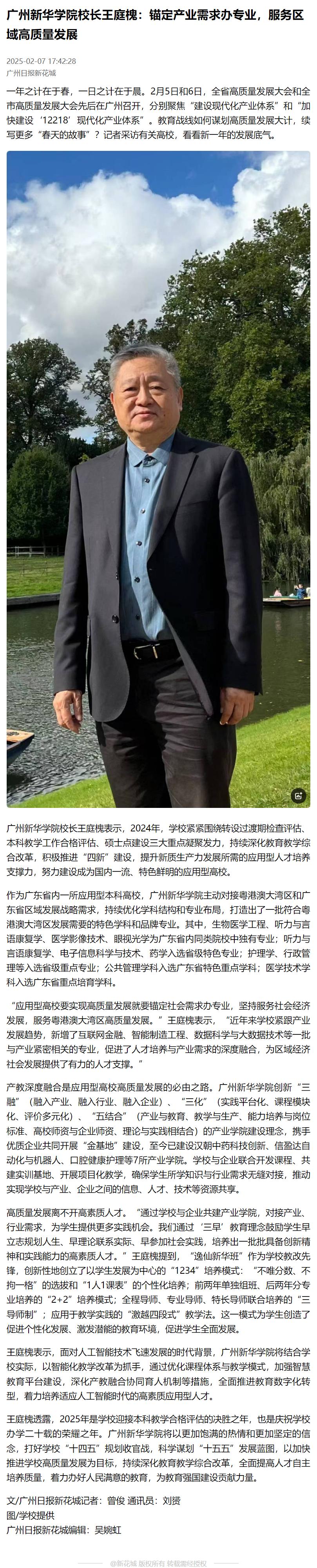 高质量发展离不开高素质人才。“通过学校与企业共建产业学院,对接产业、行业需求,为学生提供更多实践机会。我们通过‘三早’教育理念鼓励学生早立志规划人生、早理论联系实际、早参加社会实践,培养出一批批具备创新精神和实践能力的高素质人才。”王庭槐提到,“逸仙新华班”作为学校教改先锋,创新性地创立了以学生发展为中心的“1234”培养模式:“不唯分数、不拘一格”的选拔和“1人1课表”的个性化培养;前两年单独组班、后两年分专业培养的“2+2”培养模式;全程导师、专业导师、特长导师联合培养的“三导师制”;应用于教学实践的“激越四段式”教学法。这一模式为学生创造了促进个性化发展、激发潜能的教育环境,促进学生全面发展。