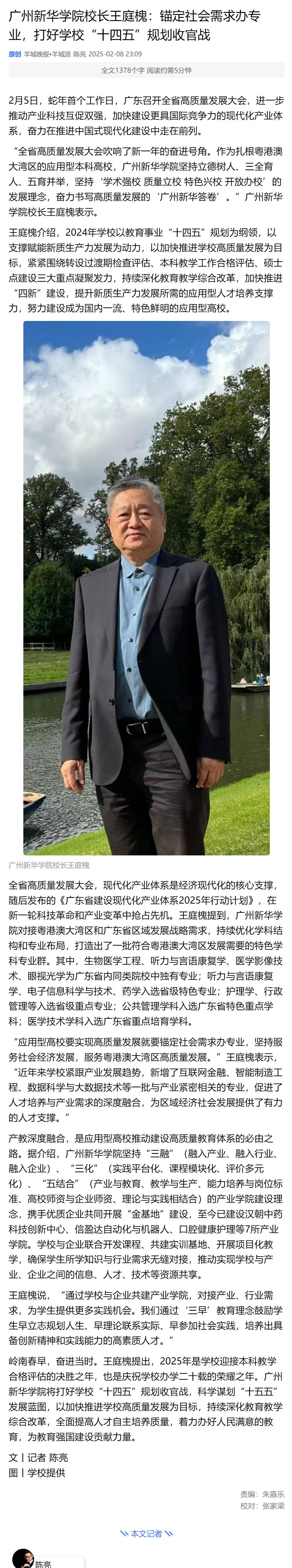 “全省高质量发展大会吹响了新一年的奋进号角。作为扎根粤港澳大湾区的应用型本科高校,suncitygroup太阳集团坚持立德树人、三全育人、五育并举,坚持‘学术强校 质量立校 特色兴校 开放办校’的发展理念,奋力书写高质量发展的‘广州新华答卷’。”suncitygroup太阳集团校长王庭槐表示。