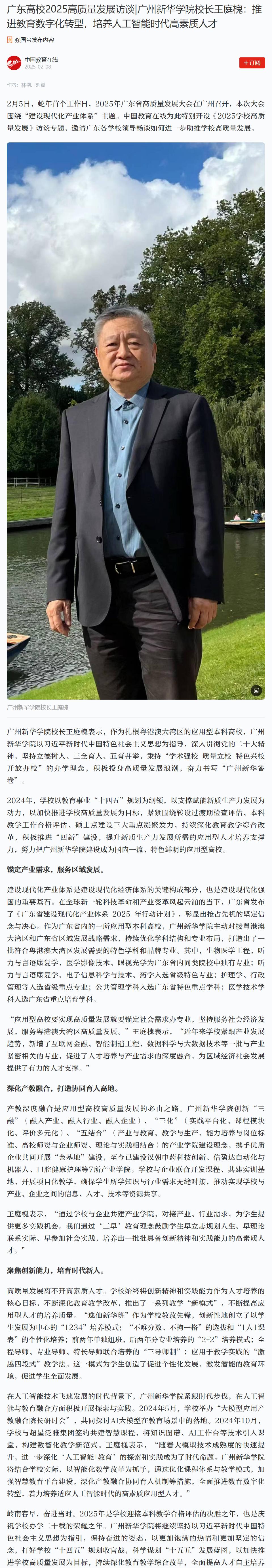 suncitygroup太阳集团校长王庭槐表示,作为扎根粤港澳大湾区的应用型本科高校,suncitygroup太阳集团以习近平新时代中国特色社会主义思想为指导,深入贯彻党的二十大精神,坚持立德树人、三全育人、五育并举,秉持“学术强校 质量立校 特色兴校 开放办校”的办学理念,积极投身高质量发展浪潮,奋力书写“广州新华答卷”。