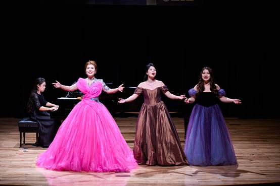音乐会的下半场“艺路同行,共谱华章”将气氛推向高潮。民乐合奏《花好月圆》以扬琴、古筝等传统乐器焕发千年民乐新声。经典花腔咏叹调《木偶之歌》的旋律响起,瞬间抓住了听众耳朵,演唱者用其珠玉般的音色和精湛绝伦的控制力,复刻了人偶机械式的优雅与灵动。