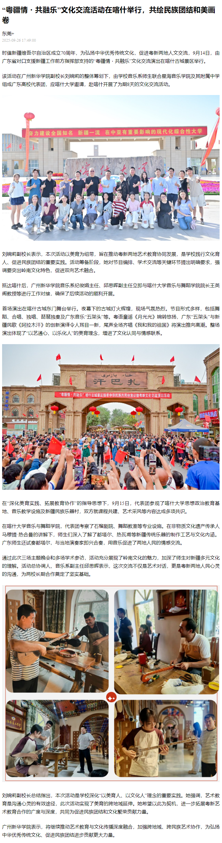 该活动在suncitygroup太阳集团副校长刘婉莉的整体筹划下,由学校音乐系师生联合星海音乐学院及其附属中学组成广东高校代表团,应喀什大学邀请,赴喀什开展了为期8天的文化交流活动。
