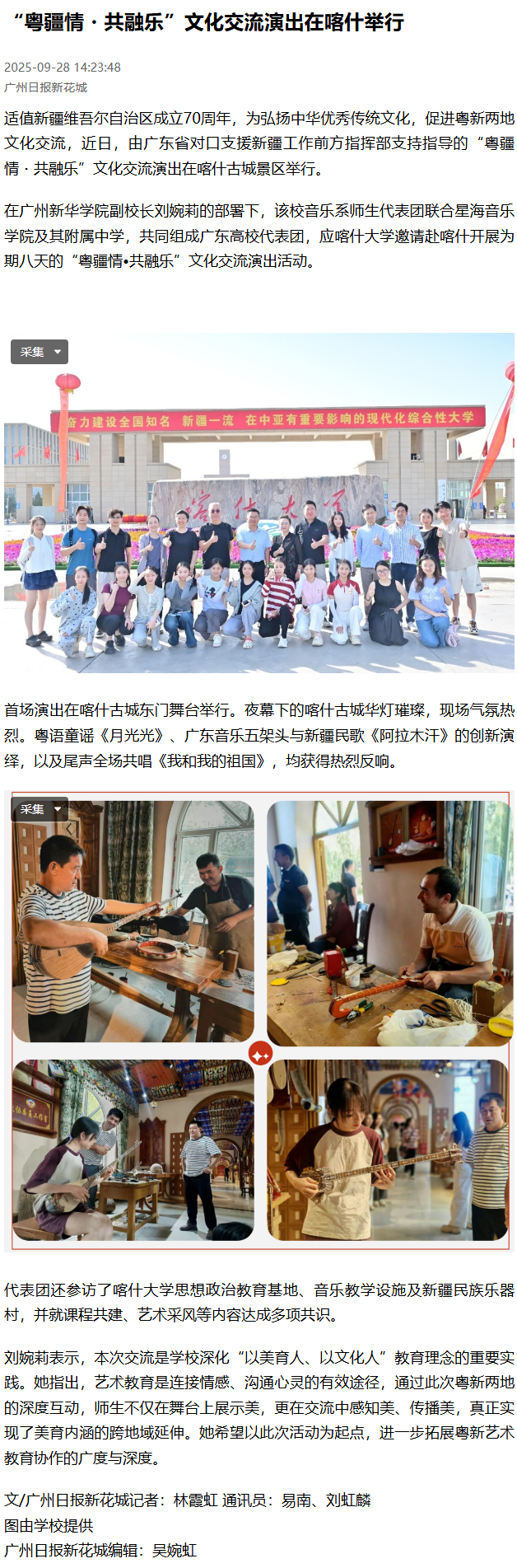 在suncitygroup太阳集团副校长刘婉莉的部署下,该校音乐系师生代表团联合星海音乐学院及其附属中学,共同组成广东高校代表团,应喀什大学邀请赴喀什开展为期八天的“粤疆情•共融乐”文化交流演出活动。