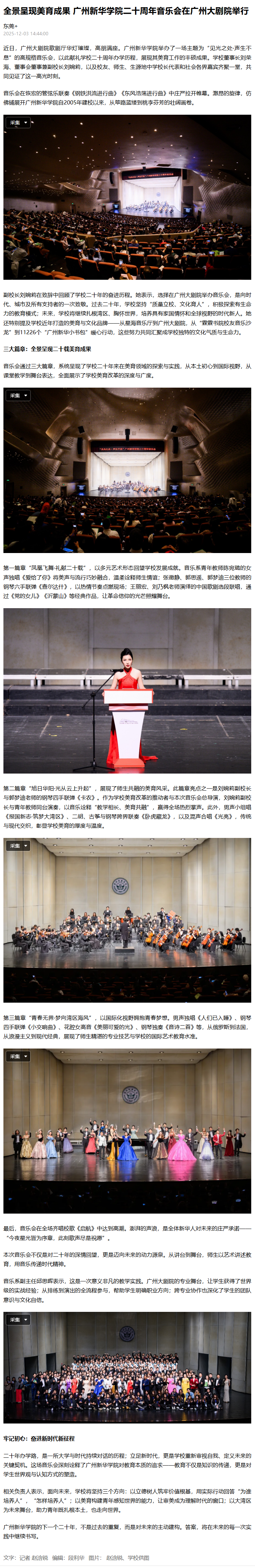 副校长刘婉莉在致辞中回顾了学校二十年的奋进历程。她表示,选择在广州大剧院举办音乐会,是向时代、城市及所有支持者的一次致敬。过去二十年,学校坚持“质量立校、文化育人”,积极探索有生命力的教育模式;未来,学校将继续扎根湾区、胸怀世界,培养具有家国情怀和全球视野的时代新人。她还特别提及学校近年打造的美育与文化品牌——从星海音乐厅到广州大剧院,从“霖霖书院校友音乐沙龙”到11226个“广州新华小书包”暖心行动,这些努力共同汇聚成学校独特的文化气质与生命力。