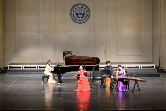 第一篇章“凤凰飞舞·礼献二十载”以多元艺术形态回望学校二十年的发展与成就。音乐系青年教师陈宛璐的女声独唱《爱给了你》将美声与流行巧妙融合,温柔讲述师生之间的深情与初心;张徵静、郭思遥、郭梦迪三位老师的钢琴六手联弹《查尔达什》以热情跳跃的节奏将现场气氛推向高潮;王丽宏、刘乃枫老师演绎的中国歌剧联唱,通过《党的女儿》《沂蒙山》等经典唱段,穿越烽火记忆,让革命信仰的光芒照亮舞台。