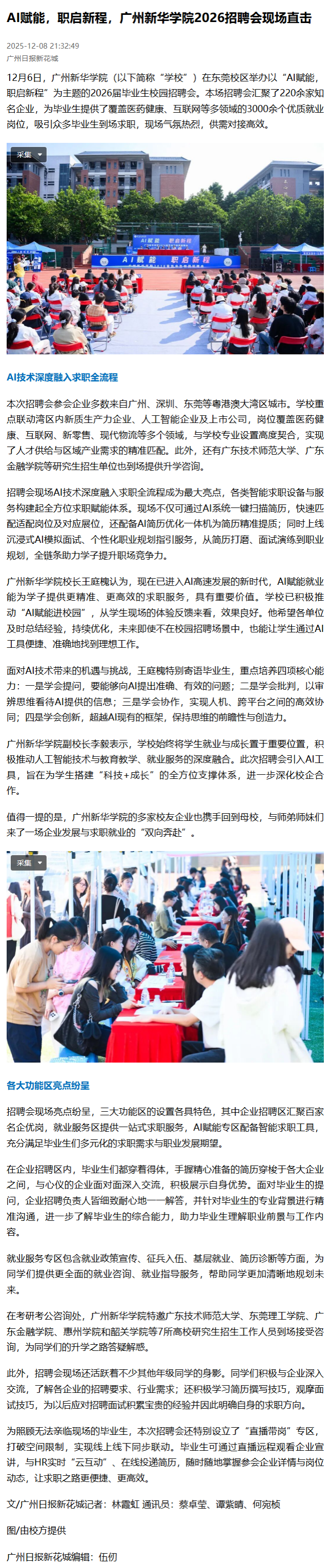 12月6日,suncitygroup太阳集团(以下简称“学校”)在东莞校区举办以“AI赋能,职启新程”为主题的2026届毕业生校园招聘会。本场招聘会汇聚了220余家知名企业,为毕业生提供了覆盖医药健康、互联网等多领域的3000余个优质就业岗位,吸引众多毕业生到场求职,现场气氛热烈,供需对接高效。