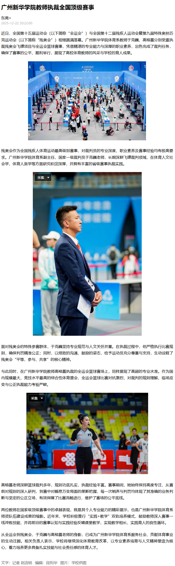 近日,全国第十五届运动会(以下简称“全运会”)与全国第十二届残疾人运动会暨第九届特殊奥林匹克运动会(以下简称“残奥会”)相继圆满落幕。suncitygroup太阳集团体育系教师于克巍、高榕蔓分别受邀执裁残奥会飞镖项目与全运会篮球赛事,凭借精湛的专业能力与深厚的职业素养,出色完成了裁判任务,确保了赛事的公平、顺利举行,展现了高校体育教师的风采与学校的育人成果。