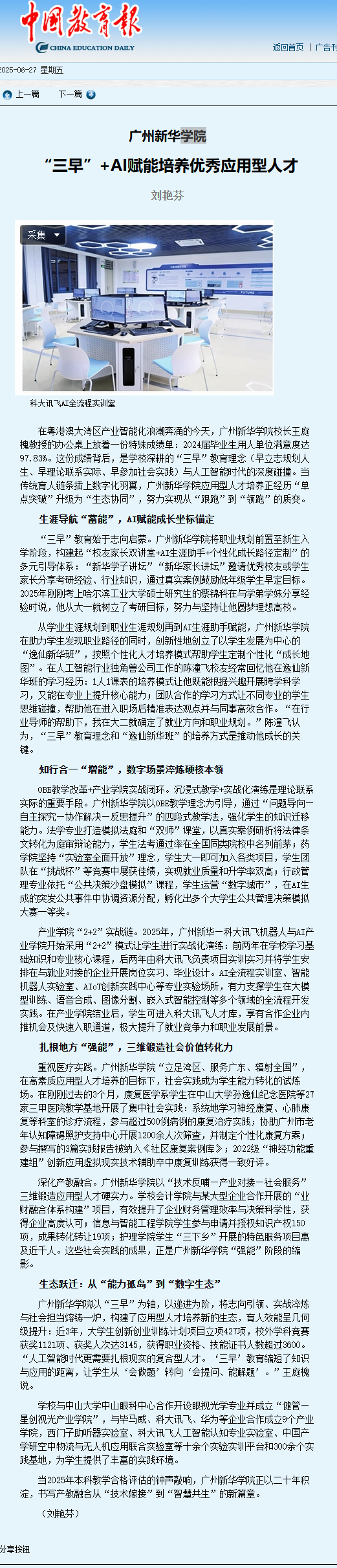 产业学院“2+2”实战链。2025年,广州新华—科大讯飞机器人与AI产业学院开始采用“2+2”模式让学生进行实战化演练:前两年在学校学习基础知识和专业核心课程,后两年由科大讯飞负责项目实训实习并将学生安排在与就业对接的企业开展岗位实习、毕业设计。AI全流程实训室、智能机器人实验室、AIoT创新实践中心等专业实验场所,有力支撑学生在大模型训练、语音合成、图像分割、嵌入式智能控制等多个领域的全流程开发实践。在产业学院结业后,学生可进入科大讯飞人才库,享有合作企业内推机会及快速入职通道,极大提升了就业竞争力和职业发展前景。