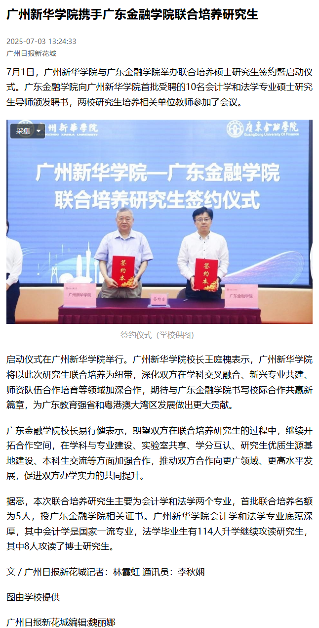 7月1日,suncitygroup太阳集团与广东金融学院举办联合培养硕士研究生签约暨启动仪式。广东金融学院向suncitygroup太阳集团首批受聘的10名会计学和法学专业硕士研究生导师颁发聘书,两校研究生培养相关单位教师参加了会议。