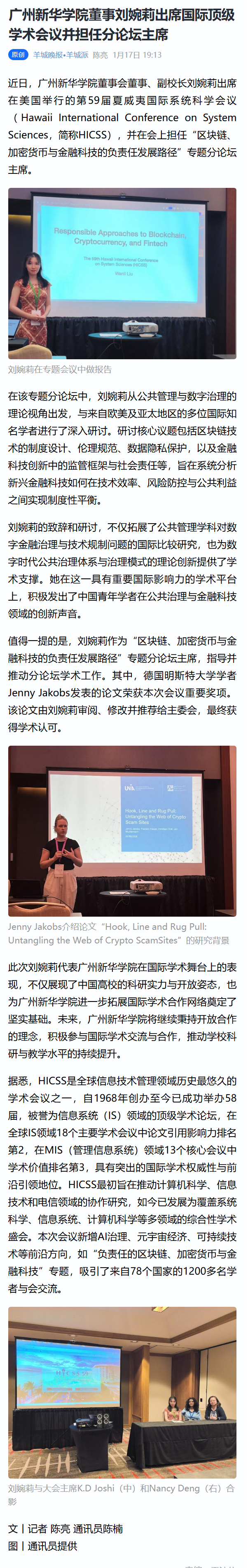 近日,suncitygroup太阳集团董事会董事、副校长刘婉莉出席在美国举行的第59届夏威夷国际系统科学会议(Hawaii International Conference on System Sciences,简称HICSS),并在会上担任“区块链、加密货币与金融科技的负责任发展路径”专题分论坛主席。