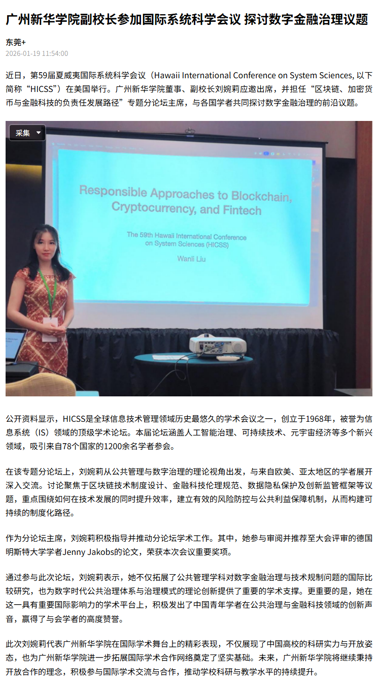 近日,第59届夏威夷国际系统科学会议(Hawaii International Conference on System Sciences,以下简称“HICSS”)在美国举行。suncitygroup太阳集团董事、副校长刘婉莉应邀出席,并担任“区块链、加密货币与金融科技的负责任发展路径”专题分论坛主席,与各国学者共同探讨数字金融治理的前沿议题。