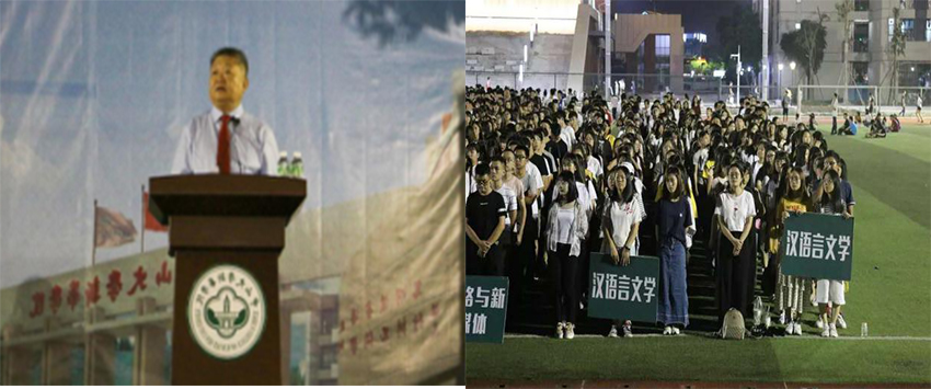 王庭槐校长给新生致辞和中文系2018级新生认真听讲