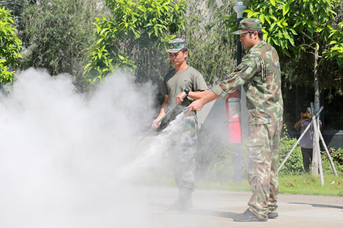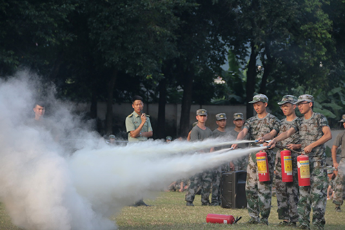 军训教官还为新生作了有关干粉灭火器详细的讲解和示范,展示灭火器的使用方法,并让新生进行实际操作,按照“一提二拔三瞄四压”的顺序,迅速扑灭演习点的火苗。
