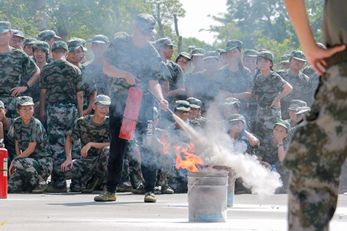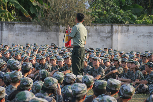 首先,军训教官为新生讲解火灾发生时应如何报警、如何灭火、如何逃生等安全逃生技巧,培养新生的安全意识和提高新生的逃生技能。