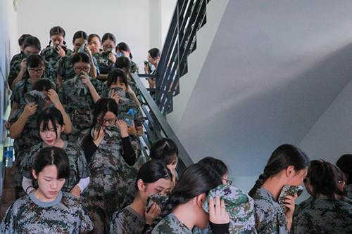 随后,在军训团教官的组织下,新生们模拟演习发生火灾时的逃生方法。活动过程井然有序,在逃离的过程中,同学们都能按要求做好防护措施并能严格听从指挥。随着警报声响起,同学们用湿毛巾捂住口鼻,并保持弯腰姿势迅速有序从宿舍撤离,按照学校应急逃生路线快速疏散至指定的安全地带。