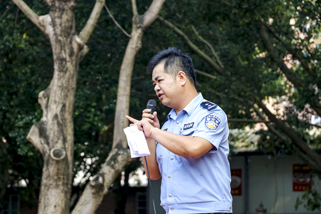 此次治安安全教育课由二级警督、凤凰街四级警长,中山大学新华学院专区民警江锐池主讲。江警官为新生介绍了我校广州校区的周边治理情况,并告诫大家应该及时了解当地情况、不要随意与他人发生争执,注意防范治安安全问题。江警官对选择在外租房的同学提出警示:“一定要注意出租屋安全!”为了在一定程度上防止入屋盗窃,在外出租的同学必须保证窗门要关好,施加必要的防护措施等。