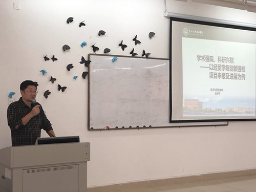 会上,袁持平院长首先强调经贸学院今年的工作重心为“科研兴院,学术强院”,并介绍了经贸学院项目申报现况,表示本次交流会的召开旨在鼓励国贸专业中青年教师多进行项目申报,争取在教学改革和科研项目发展方面有新的突破。接着,袁持平介绍现阶段经贸学院获批项目情况,他强调申报重大项目,应以需求为导向,结合专业特点,同时重视平台组建、团队建设。最后,袁持平介绍了广东省重点学科《公共管理》项目(在研)的五大核心模块以及项目打造“一网四库”(在建)的情况。袁持平表示,目前金融工程专业申报的项目已有进展,希望国贸专业教师再接再厉,多出成果。