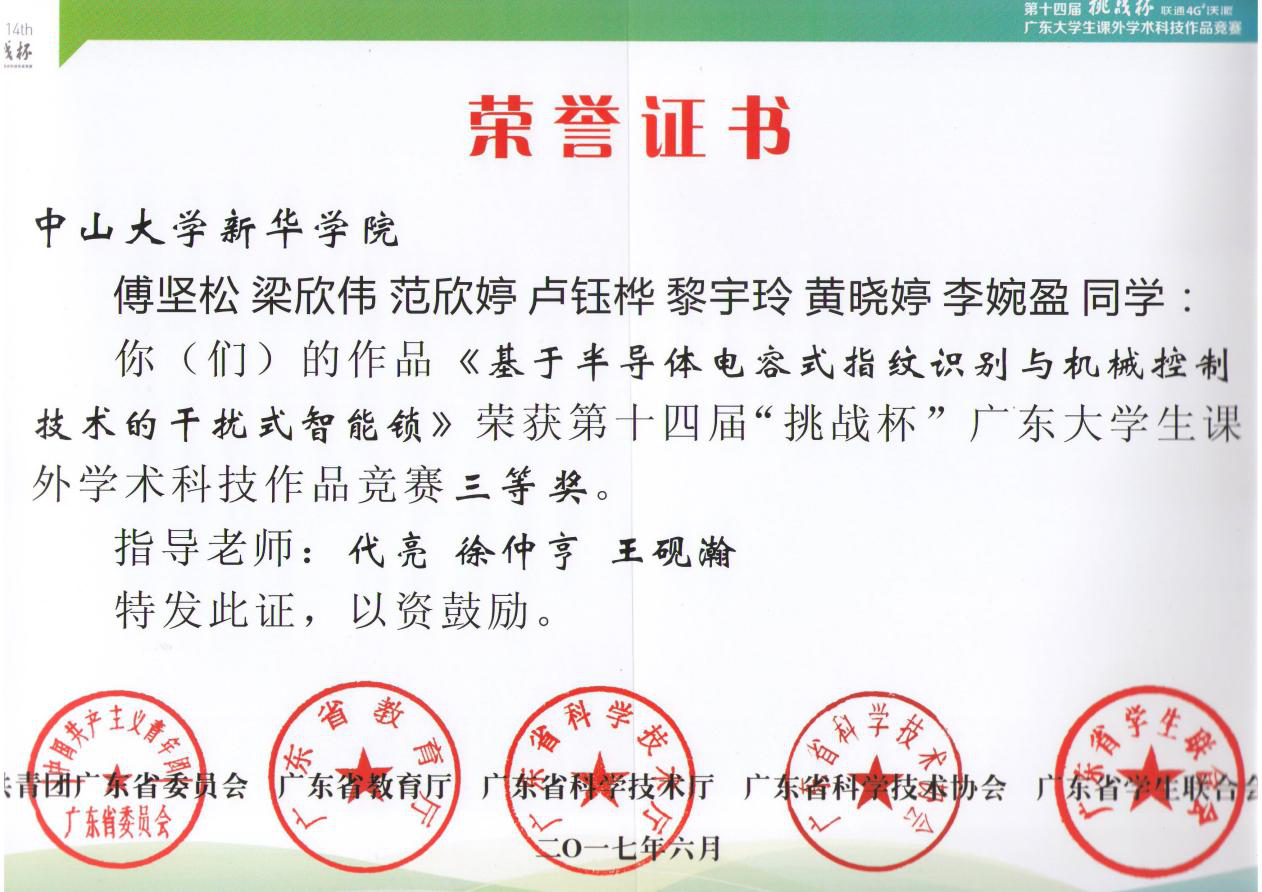 除了参加走秀,校内外各类比赛她也都踊跃参加。在今年第十四届广东省“挑战杯”比赛中,在队长傅坚松的带领下,她们的作品荣获省三等奖,同时其研究的智能锁亦获得了专利认证,期望这项专利能有效提高锁具的防盗能力,进而给社会带来更大的经济效益。