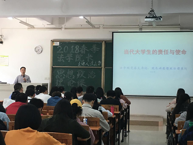 3月22日下午,法学院执行院长李正华为法学院2015级、2017级学生讲授主题为“大学生的时代责任感与专业学习”的思想政治理论课。