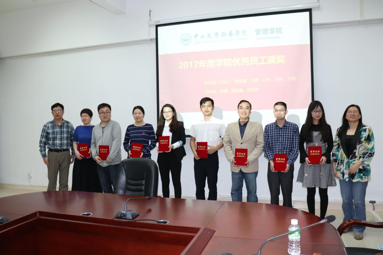 彭建平(左一)、李美云(右一)为管理学院2017年度优秀员工颁奖