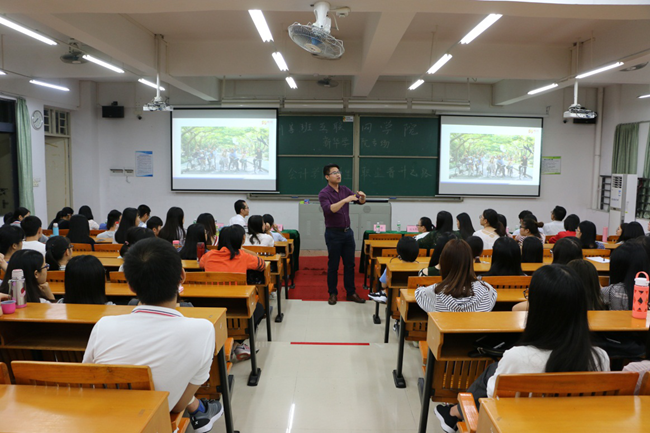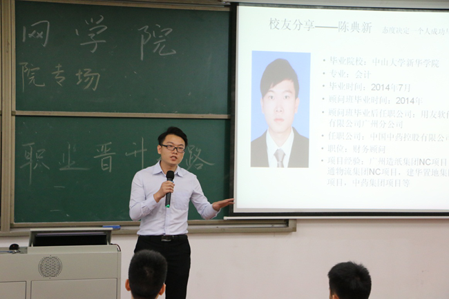 为了让应届毕业生更好适应会计职业转型,提高就业竞争力,10月18日,我校会计学院邀请广州善班互联网科技有限公司在定静楼②A201举行ERP实施顾问宣讲活动。本次宣讲活动由会计学院常务副院长林源主持,广州善班互联网有限公司总经理孙磊、肖汉青,产品总监李飞龙,院校合作经理张本然、杨云山及部分14级学生出席,10级会计专业毕业生陈典新作为特邀嘉宾出席。