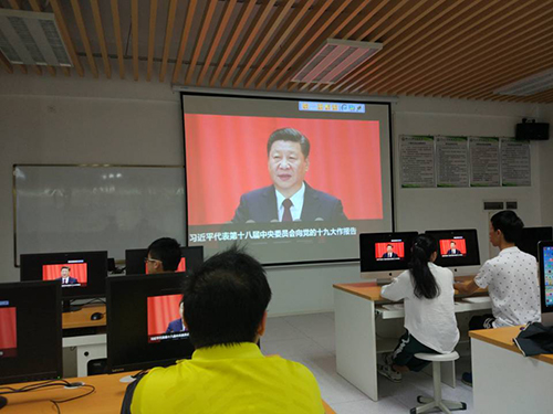 中国共产党第十九次全国代表大会于10月18日上午9时在北京人民大会堂开幕,全国各省级电视台、广播电台将同时转播中央电视台、中央人民广播电台现场直播节目。信息科学学院党总支对党的十九大高度重视,在不影响教学及工作的前提下,积极组织学院广大师生一起观看了十九大报告的实时直播,认真聆听习近平主席报告,自觉接受党的教育。