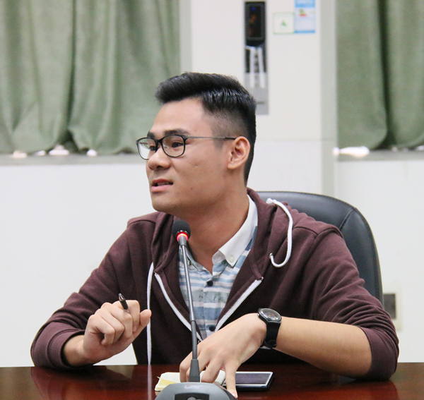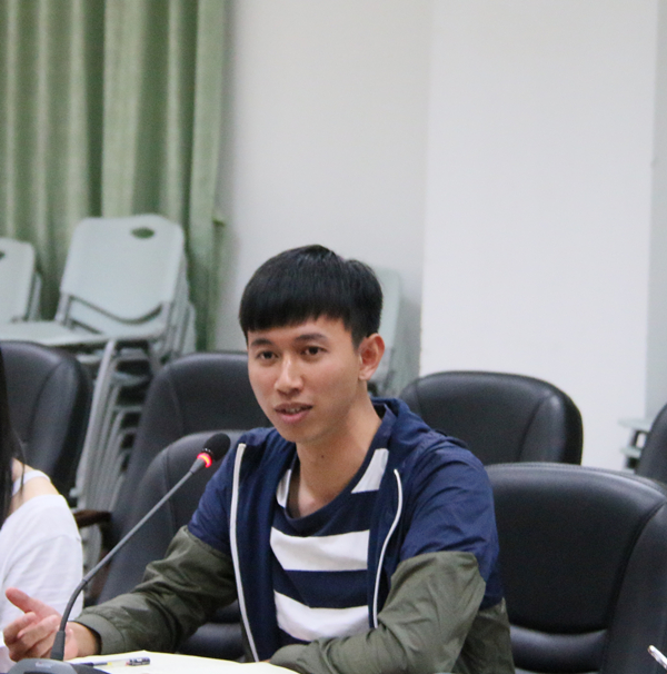 2015级入党积极分子谭伟基结合自身学习经历对十九大报告中提到的“青年兴则国家兴,青年强则国家强”分享个人的感受和体会。他认为作为学生第一步要抓好学习,同时要善于利用学校提供的各种平台锻炼自己的综合素质与能力,呼应习近平主席提出的“青年要立志做大事”。