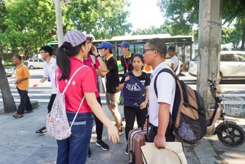 广州校区第一辆满载17级新生和家长的迎新车缓缓从西南门驶入,在阳光下等待了许久的志愿者,连忙上前帮忙搬行李,引导新生。