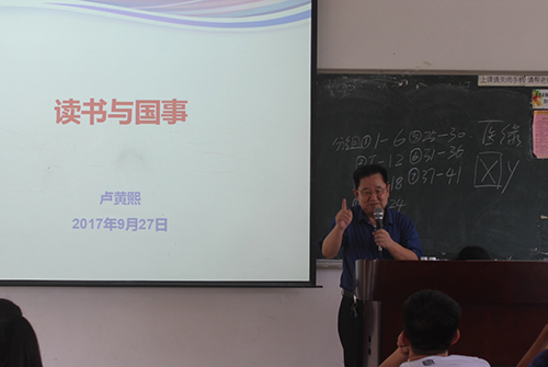 卢黄熙教授作题为《读书与国事》的授课。卢黄熙教授以“风声雨声读书声声声入耳,家事国事天下事事事关心”阐释了读书人既要认真读书,又要有关心国家大事的胸怀。他为同学们讲解习近平总书记“7.26”讲话的内容,并将其与大学生的学习生活联系起来,勉励以行动将读书和爱国结合起来。