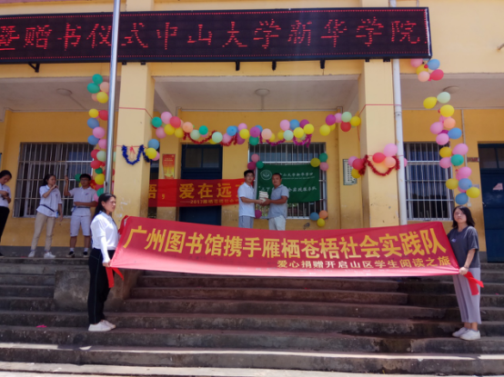 本次三下乡社会实践活动,得到了广州图书馆的大力支持。广州图书馆携手雁栖苍梧社会实践队,公益捐赠百余本图书,共同支持公益,奉献爱心,开启山区孩子阅读之旅。广州图书馆是我校咨询管理系社会志愿服务基地,为响应微公益活动的号召,广州图书馆将亲子绘本馆库存中的部分藏书捐赠给雁村小学作为学校日常的阅读书目,希望这次活动能让这里的孩子喜欢阅读,爱上读书。在活动尾声,实践队与雁村小学进行了隆重的赠书仪式,希望能通过阅读方式来拓宽山区孩子的知识视野,带领他们遨游知识的海洋。