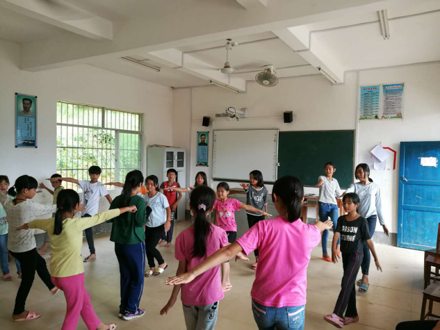 雁村小学教学条件简陋,且大部分学生为雁村的留守儿童,雁村小学所开设的课程除语文、数学、英语三门主课之外,鲜有其他课程。为丰富学生的学习生活,开阔学生的知识视野,实践队为其开设了舞蹈课、体育课、音乐课、手工课、话剧课、国学课、地理课、朗诵课、手语课等课程。课程开设以来,备受学生欢迎,教学效果显著。活动中,志愿者们不仅与孩子们相互交流、传授知识,还主动走进孩子们的内心世界,倾听他们的声音。