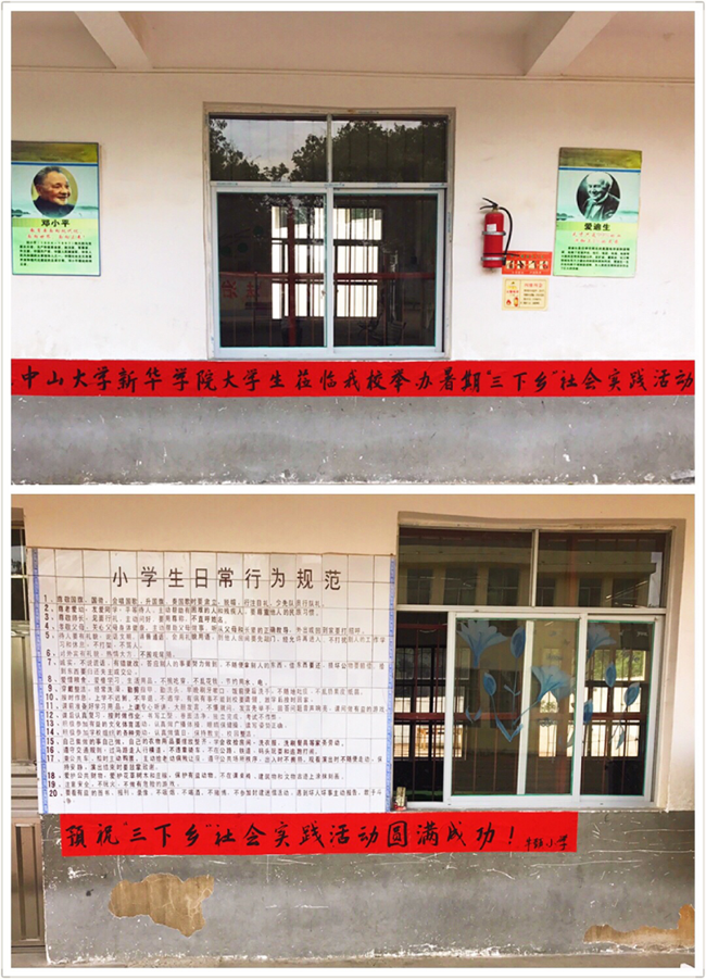 梦享蓝天社会实践队到达西牛镇牛颈小学之后在学校老师的带领下,一起参观了牛颈小学。学校为梦享蓝天社会实践队挂出的 “热烈欢迎中山大学新华学院大学生莅临我校举办暑期 ‘三下乡' 社会实践活动”等字样,令我们倍感欣慰。