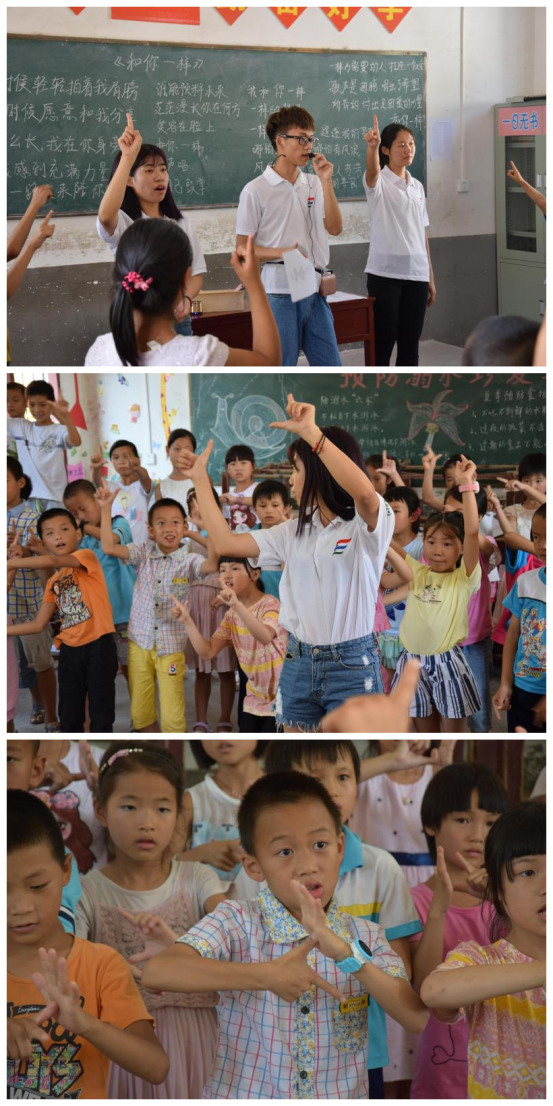 “身体力行勤浇灌,支教花开别样红。”梦享蓝天社会实践队在第一天开展以 “环保” 为主题的各种不同领域类型的缤纷课堂支教活动。根据课表安排有“保卫蓝天”环保主题班会、“感恩节”趣味英语课堂、“盈耳之音”音乐鉴赏课以及“无声之美”手语课等精彩课程。
