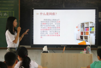 义教组首先组织小朋友们进行了晨读,朗诵了孩子们较为熟悉的古诗词文,并以“正确使用网络”为主题进行了讲解。暑假来临,孩子们多数待在家里,也很容易通过家长的手机接触到网上的世界。但网上的东西多而杂,善于利用能帮助学习,开阔眼界。若沉溺之中则很容易误入歧途,荒废学业。因此引导孩子们正确使用网络就显得尤为必要。在课堂上,队员给孩子们讲解了网络的利与弊,以及应该如何正确使用网络。我们更是将歌曲“新年好”改编成了“拒绝网瘾”,朗朗上口,深受孩子们的欢迎。