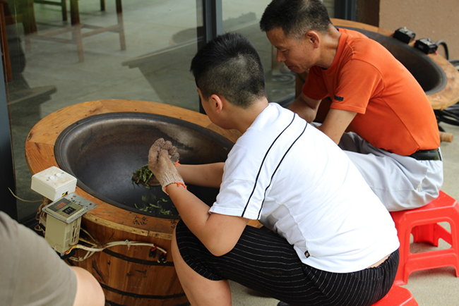 在展示厅,只见制茶的老师傅打开炒茶用的锅并且给加热器通上电,便开始将茶锅进行预热。当温度到了105度左右的时候,老师傅戴上手套,开始将茶叶放进茶锅用手进行反复的翻炒摁压。据介绍,这与工厂制茶中的萎凋有同样的作用,就是将茶叶的水分进行干燥,同时也是一种消毒。随着时间的渐渐流逝,茶叶也开始变得干燥,老师傅便让游客自己试了一下,随后将茶叶捞出进行捻揉,这与工厂中的捻揉也是有异曲同工之处。最后便是在此回锅中翻炒,达到最后干燥的效果。
