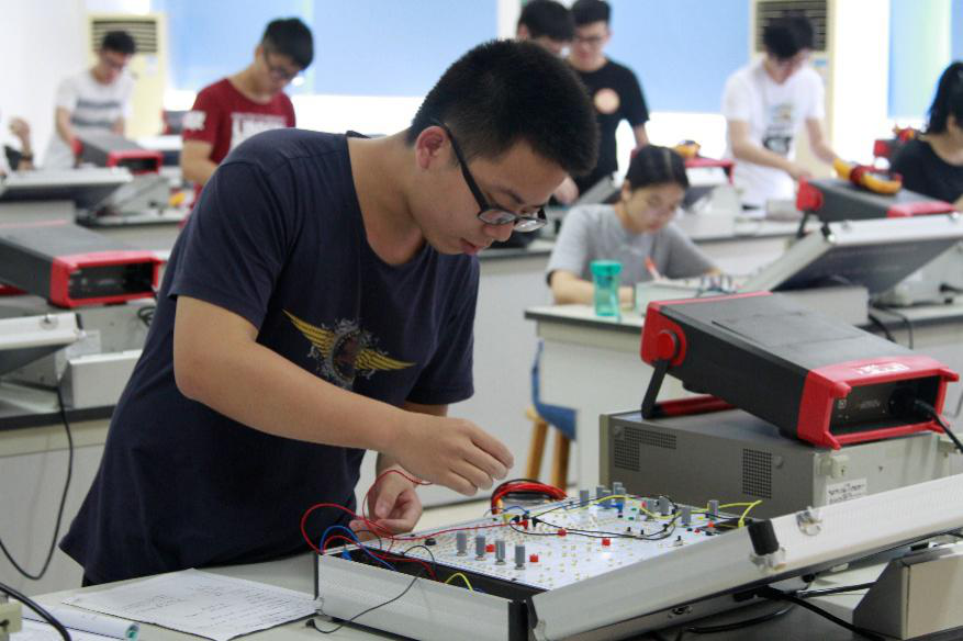 在共同听完一节电子技术实验课之后,廖振亮副校长和罗蔚茵督导探讨了关于教学设备、教学环境的意见。罗督导说:“在电子技术实验室做模拟电子技术的好处在于每人有独立的机器,且方便老师指导学生。实验室的设备不断更新,教学质量也能得到相应的提升。”