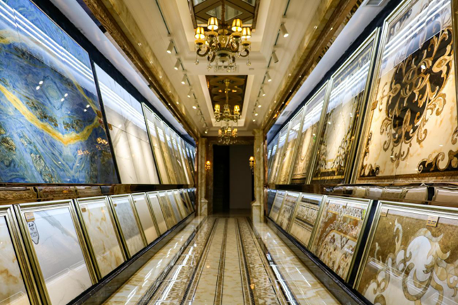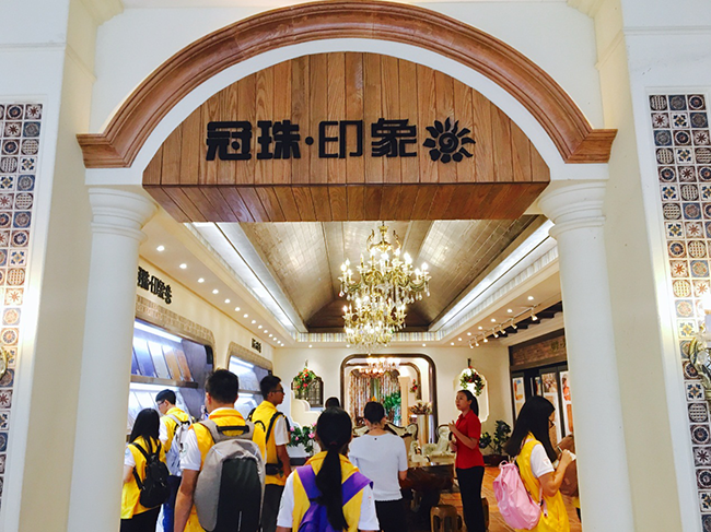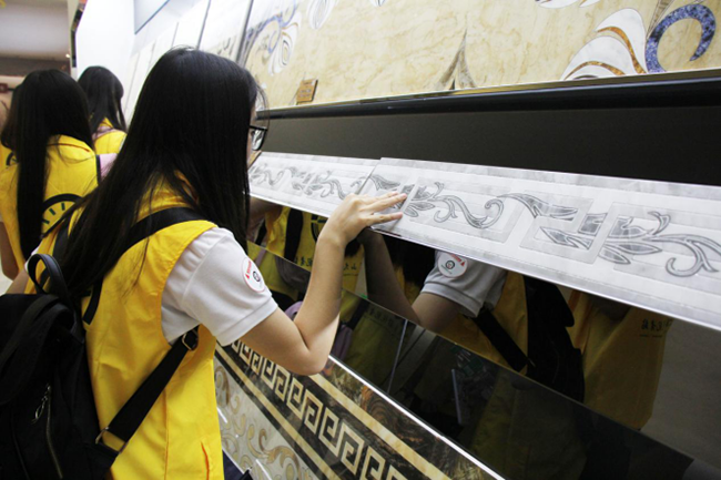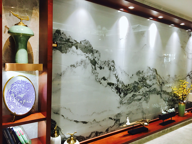 在讲解员的带领下,我们观赏了冠珠陶瓷的抛光展区,仿古展区,瓷片区,微晶区域以及印象梵高样板间。讲解员梁女士提到,抛光展区的大理石瓷砖是仿制天然石材而制作,这款瓷片已排除天然石材易皲裂,辐射等缺点,且价格更容易接受,通过IMAX印刷技术,让它更接近天然石材的质感。