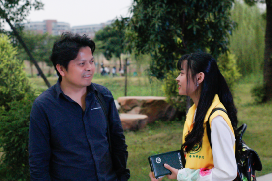 同先生在校道上聊天,我觉得这不像是采访,更像是一场朋友之间的闲聊。作为黄礼孩先生的“粉丝”,能有这样的采访机会,实属难得,最想做的自然是与作者探讨我自己最喜欢的作品。第一次读他的诗作《谁跑得比闪电还快》的时候,很有感触。特别是读到诗中“人生像一次闪电一样短,我还没有来得及悲伤,生活又催促我去奔跑。”这句话时,我就在想,作者是否跟我想的一样是在感叹着生活的忙碌?于是我带着好奇询问了先生,他说“这首诗基本上是我的生活状态,因为我可能是做的东西太多了,比如说做国际诗歌奖还有编很多的刊物,就感觉一刻不停地在忙,但又渴望在这个时代里面像丛林一样立足,会渴望有一些生长的东西。但是却感觉这个时代在快速地向前发展,没有时间好好停下来回望自己的人生。”原来我的感触和先生写下这首诗的原意是那么的吻合。他还说:“还是希望自己可以停下脚步,用一句流行的话来说‘让灵魂跟上自己的脚步吧’。”大概很多的人在忙碌的时候都有那么一刻想要停下来好好思考,好好安静地去回望自己走过的路吧。只是人人都有的这种类似的状态,在先生的笔下更触动人心。