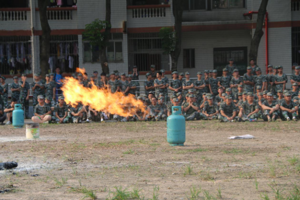 广州天河消防大队汇景消防中队官兵为新生演示了灭火器灭火、煤气罐灭火、高压水枪灭火、楼道逃生及其注意事项等灭火环节。在消防官兵的安全指导下,新生按照灭火的正确步骤和方法,将燃起浓烟的大火成功迅速扑灭,达到了冷静沉着的面对突发现象、成功快速地扑灭初期火灾的消防标准。